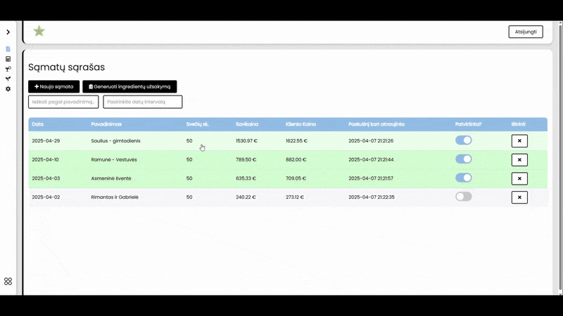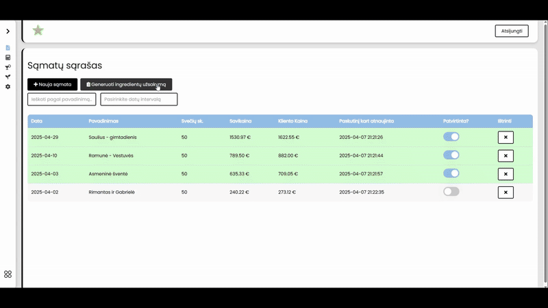 Tiek sąmatas tiek ingredientų užsakymo failą tiekėjams gali eksportuoti kaip PDF failą.