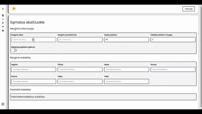 Į sistemą įveskite ingredientus su kuriais dirbate, iš jų sukurkite savo siūlomus kokteilius ir viskas, sistemoje pasirinkę šventei reikalingus kokteilius iškart gausite suskaičiuotą tikslią sąmatą!